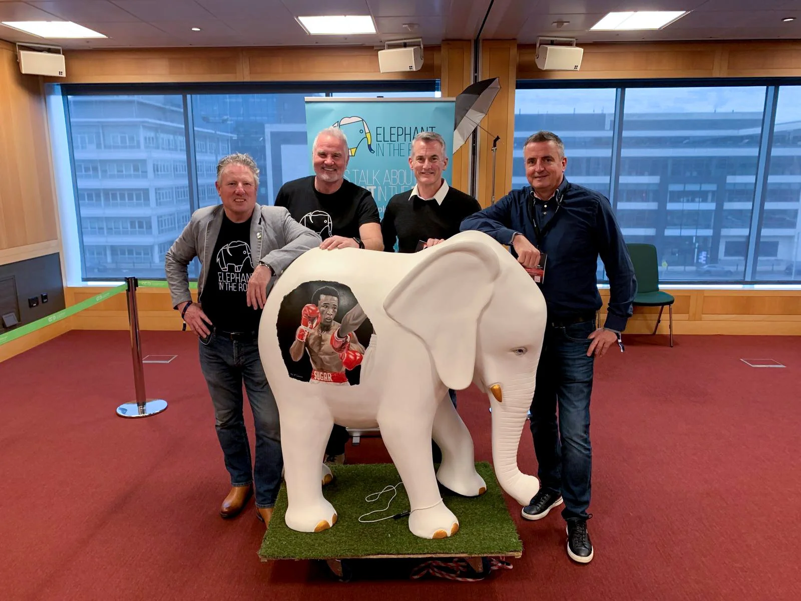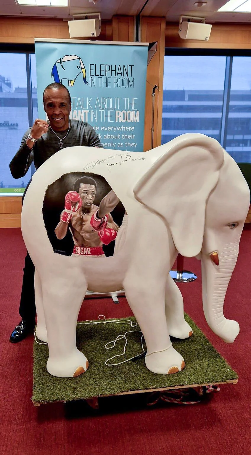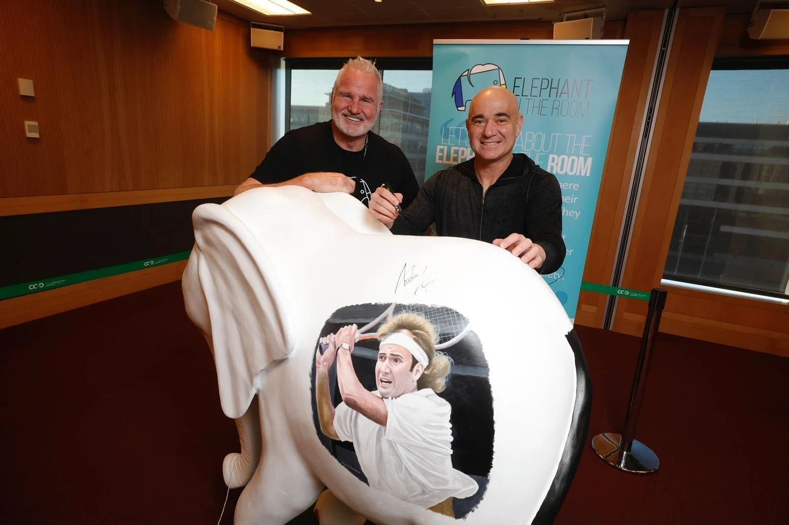 In one of Rob's most significant commissions to date, he was asked by Brent Pope - founder of The Elephant in the Room mental health movement - to create a large-scale work for a high-profile advocacy event. The result: two portraits of world champions Andre Agassi and Sugar Ray Leonard, painted directly onto a life-size plastic elephant - a striking visual metaphor for the mental health conversations we too often avoid.